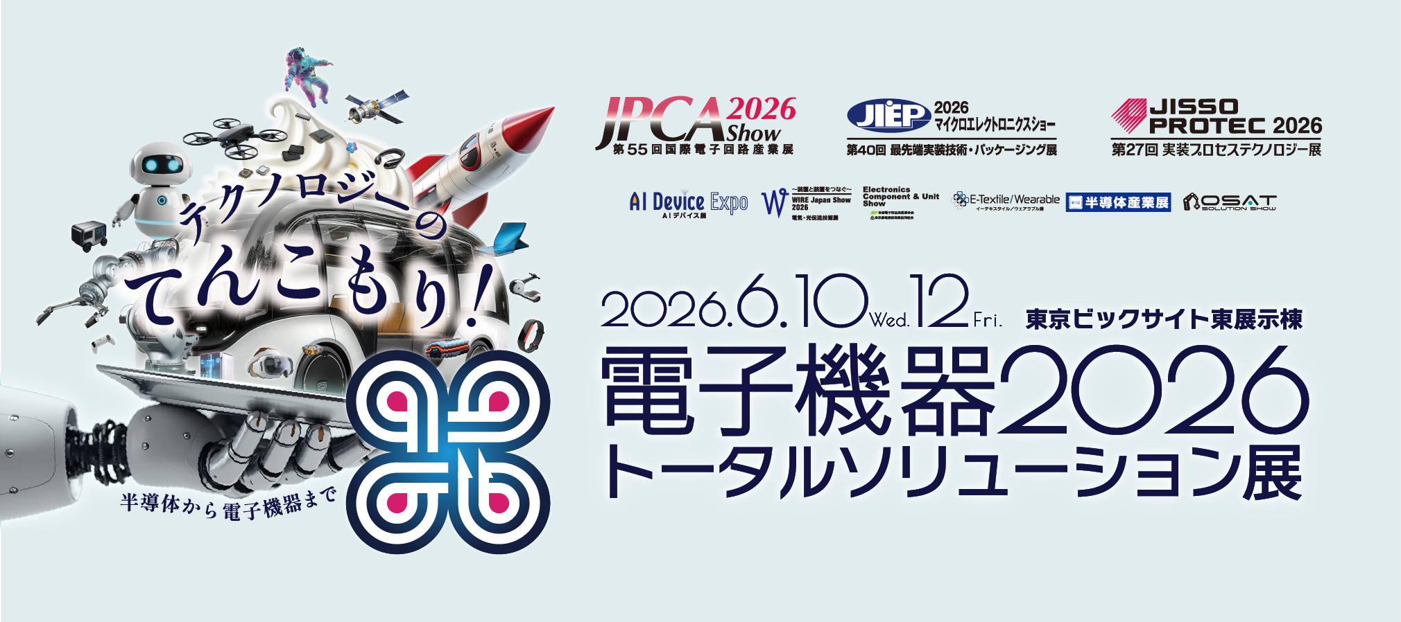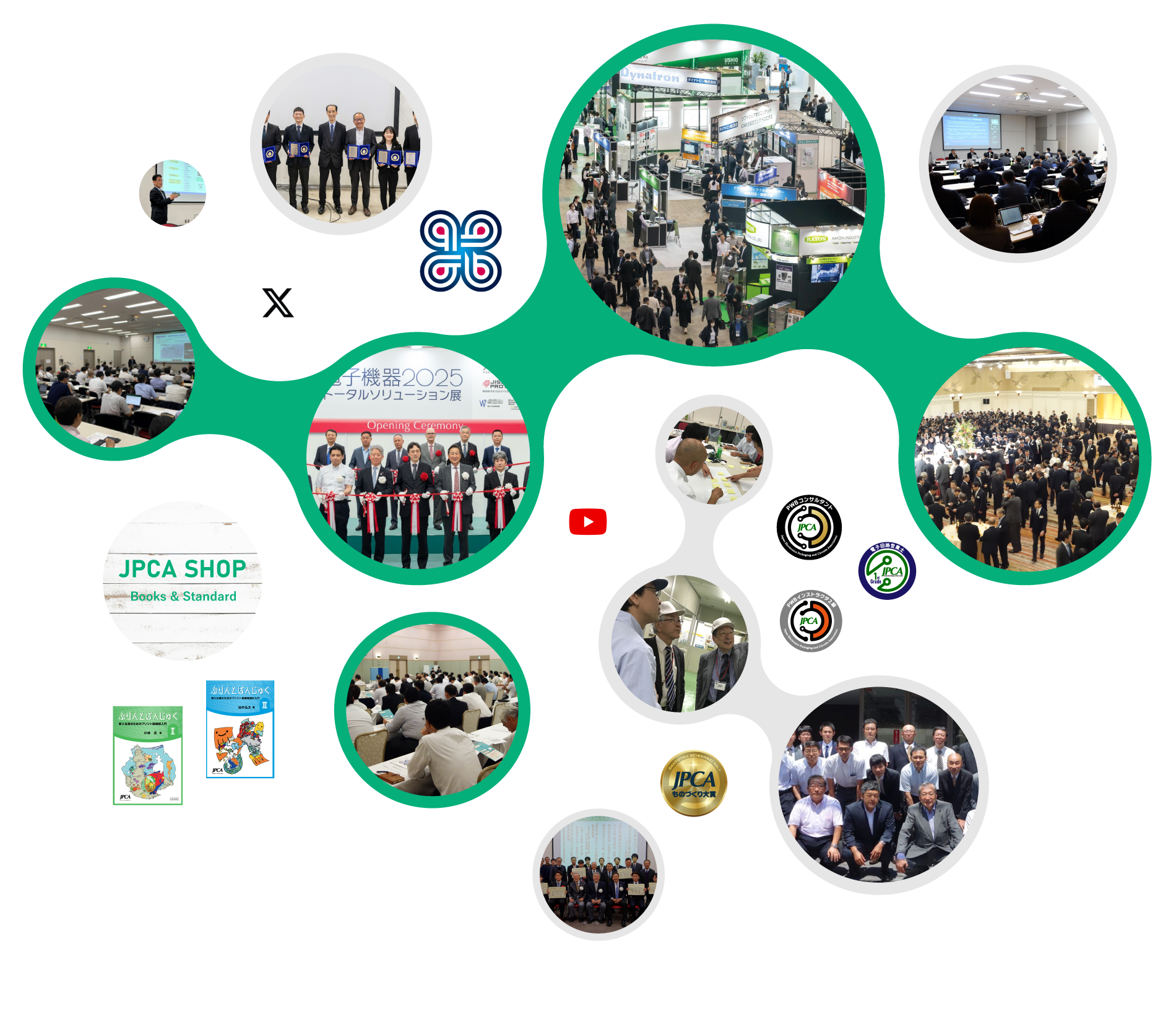 JPCAは産官学協同開催で世界最大規模を誇る「電子機器トータルソリューション展」を主催しています。また、電子回路業界における人材育成活動として、初心者から業界のプロフェッショナル向けまで、4種6つの検定制度を実施しています。生産革新と改善支援を行うことのできる改善インストラクタを養成する″JPCAものづくりアカデミー″を開講しています。その他、ロードマップセミナーをはじめとした各種セミナーや最新技術・業界動向を知るための勉強会(年一回)開催、出版(機関誌、書籍)、JPCA規格の発行等、様々な活動を行っています。
